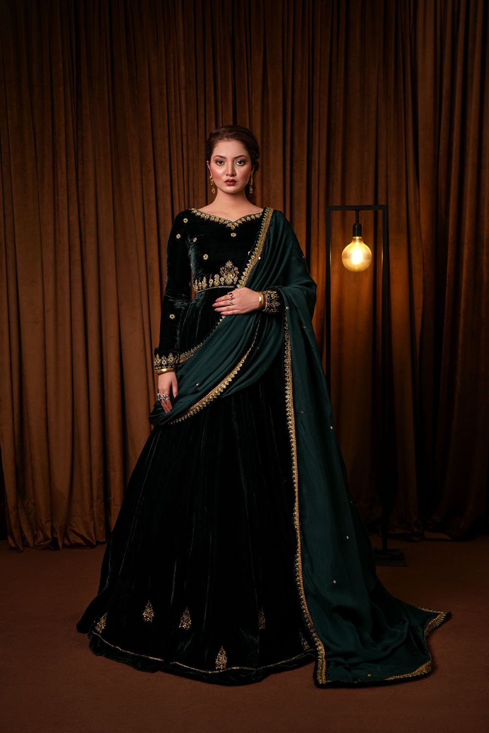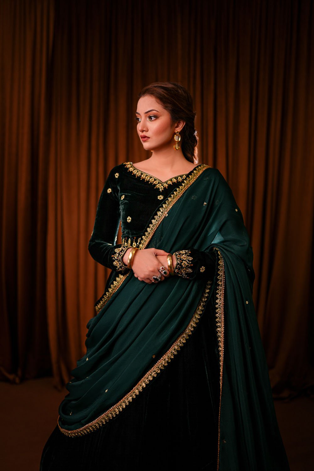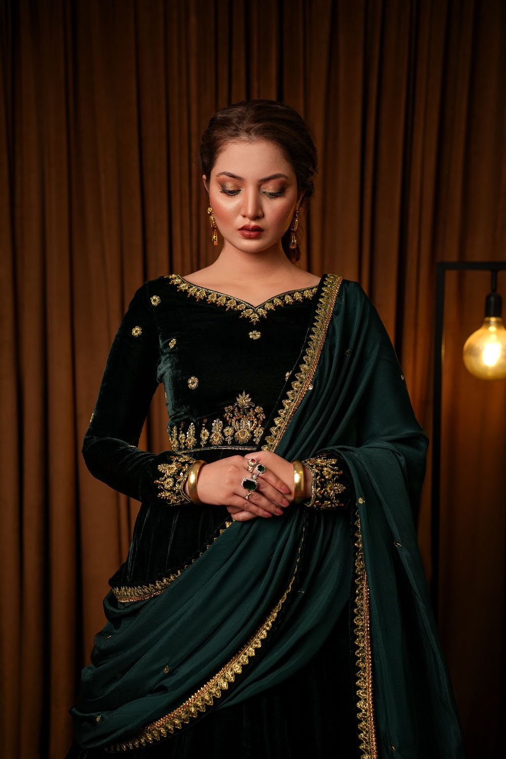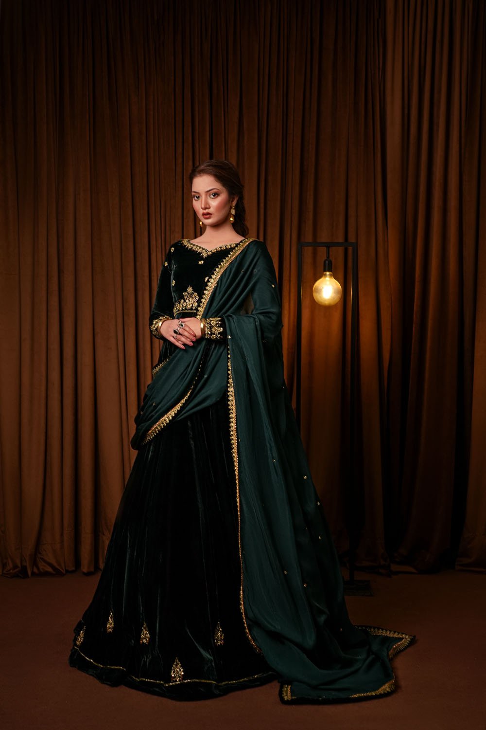 A tribute to timeless South Asian tradition, this emerald green velvet lehenga set is crafted for women who wish to honor cultural roots with elegance. The lehenga and blouse, made in rich velvet, are intricately hand-embellished with pure golden dabka and stonework, giving the outfit a regal, heritage-inspired look.