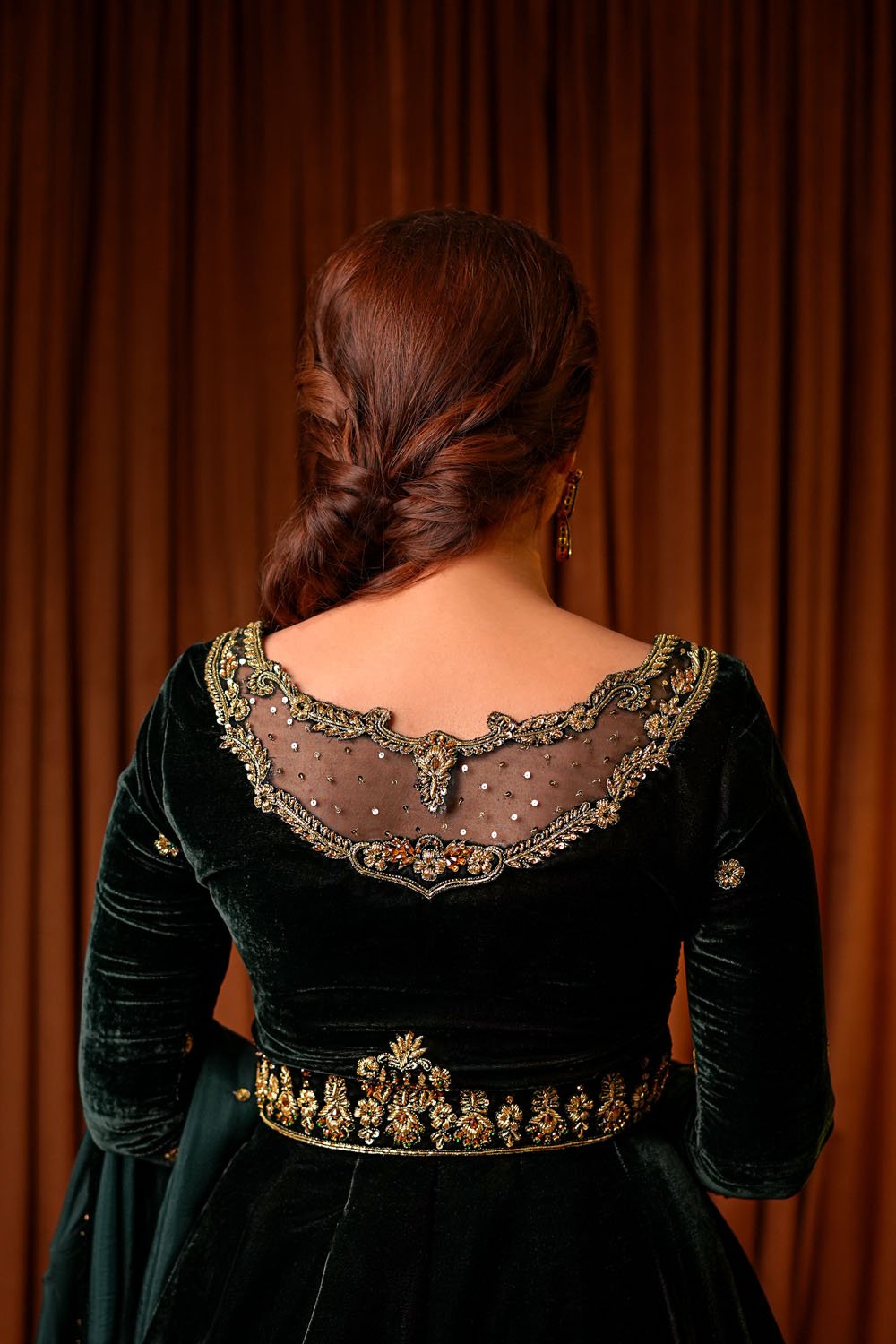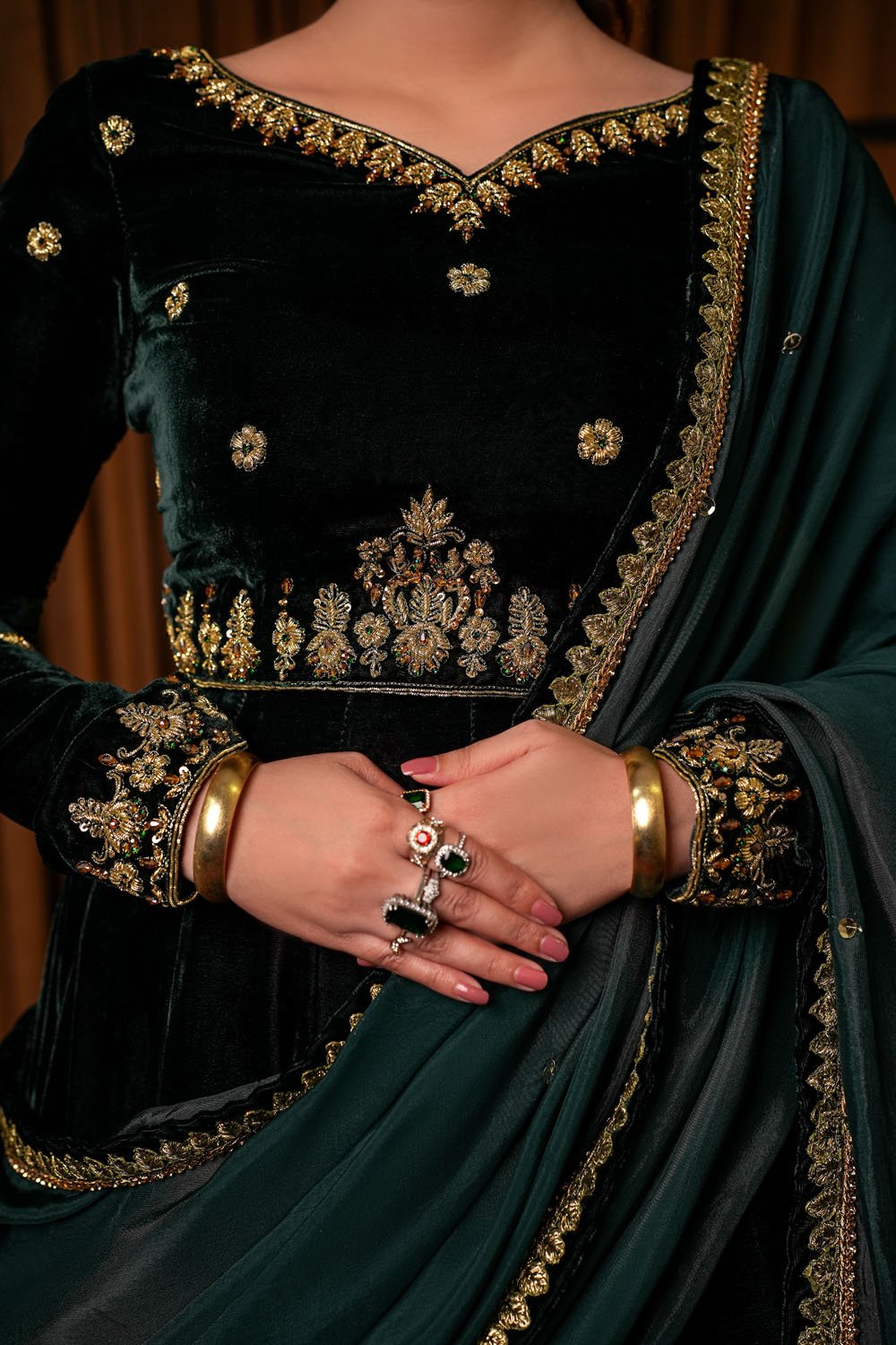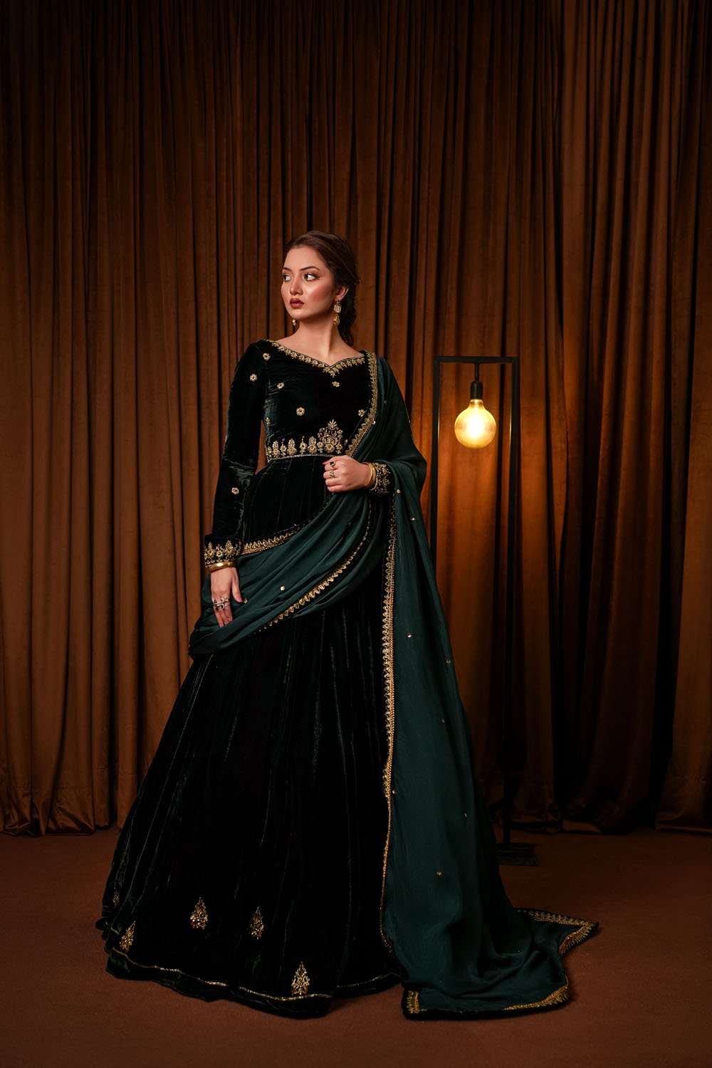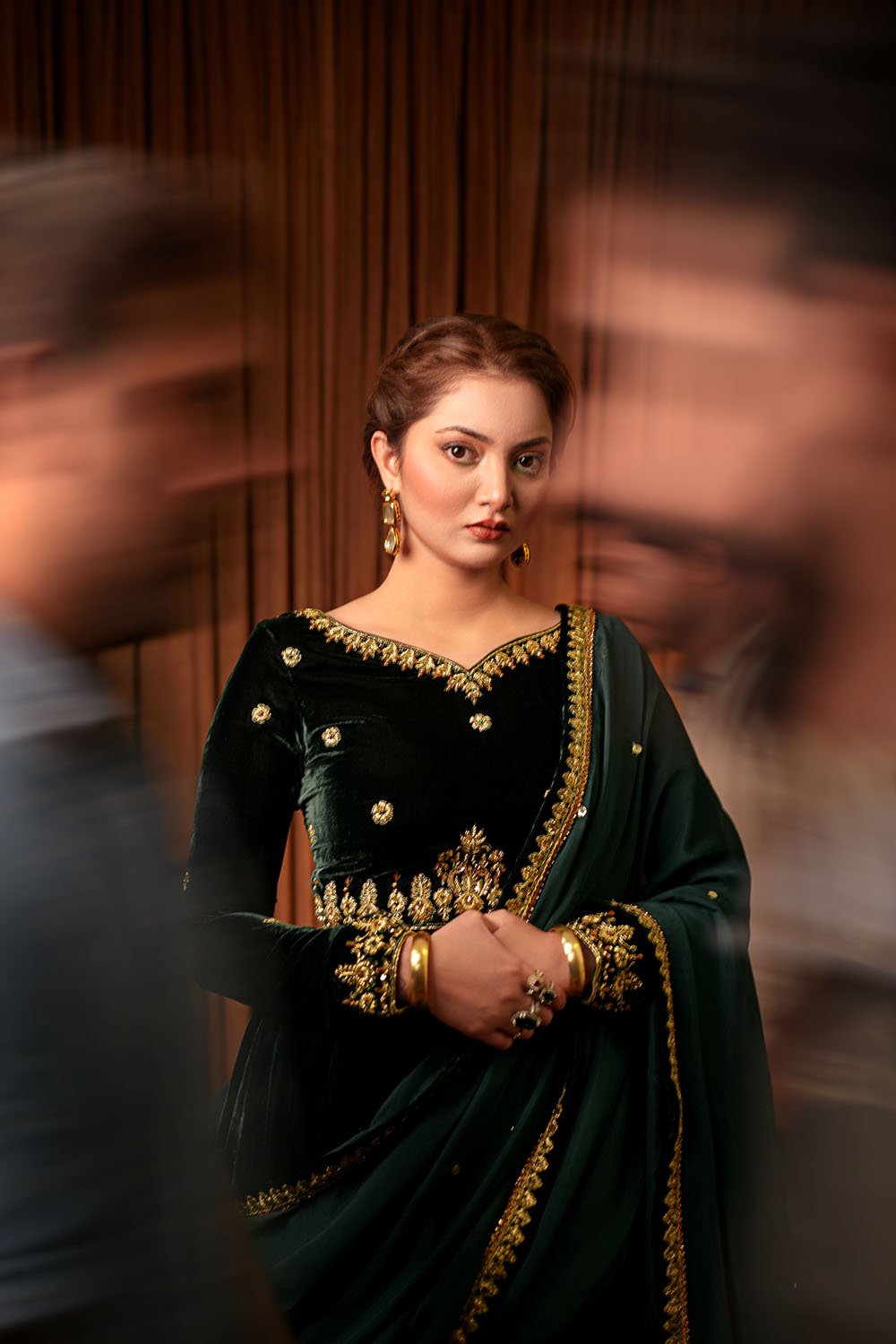 A tribute to timeless South Asian tradition, this emerald green velvet lehenga set is crafted for women who wish to honor cultural roots with elegance. The lehenga and blouse, made in rich velvet, are intricately hand-embellished with pure golden dabka and stonework, giving the outfit a regal, heritage-inspired look.