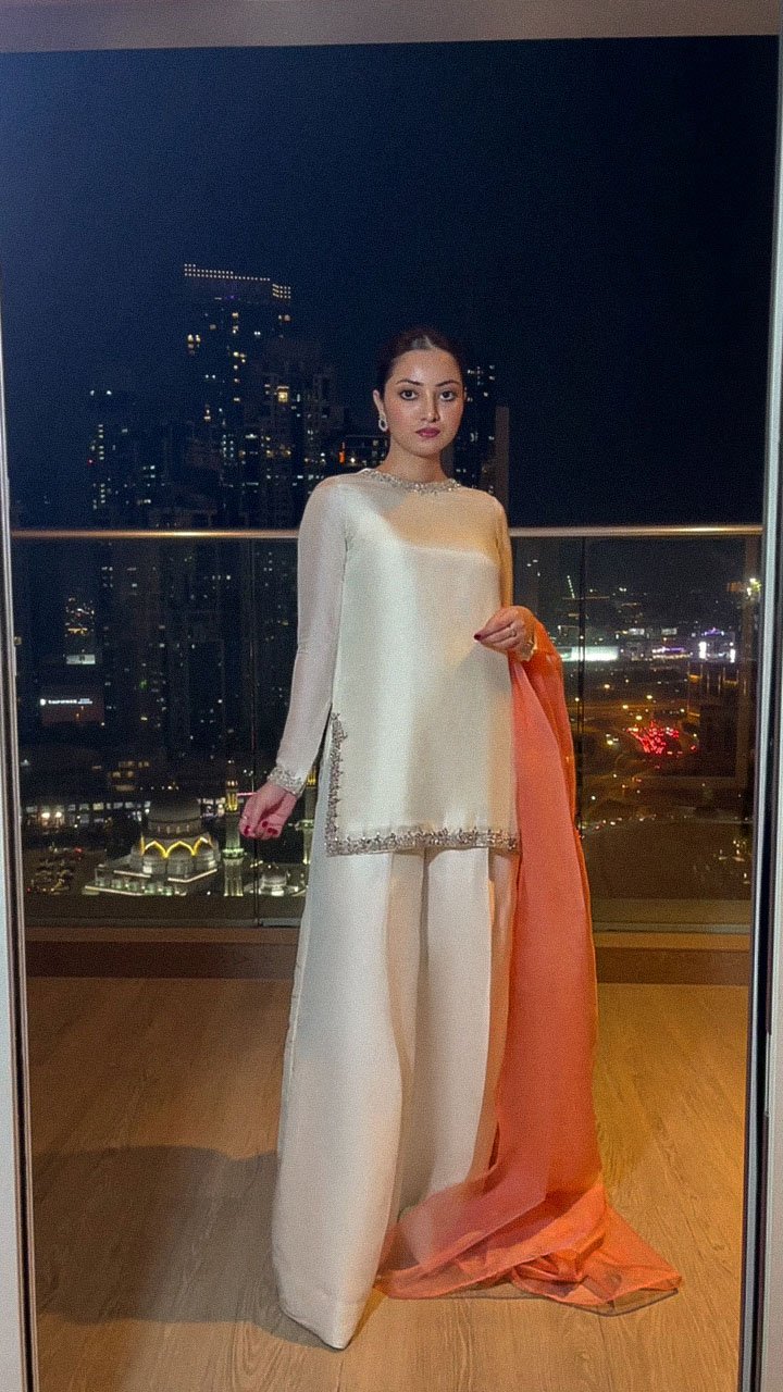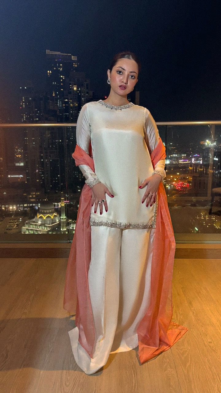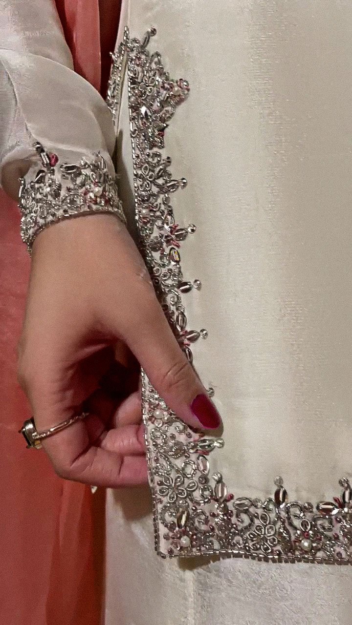 Crafted from the finest quality luxurious tassel silk, this cream-white ensemble is the perfect blend of sophistication and timeless elegance. The shirt features intricate hand embellishment along the neckline, sleeves, and front and back daman, adding a refined touch of artistry to the design.