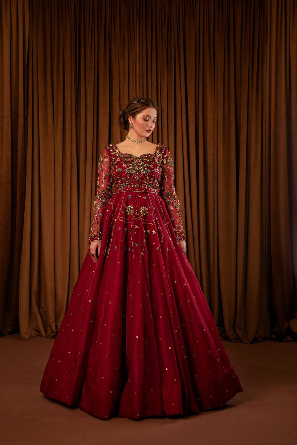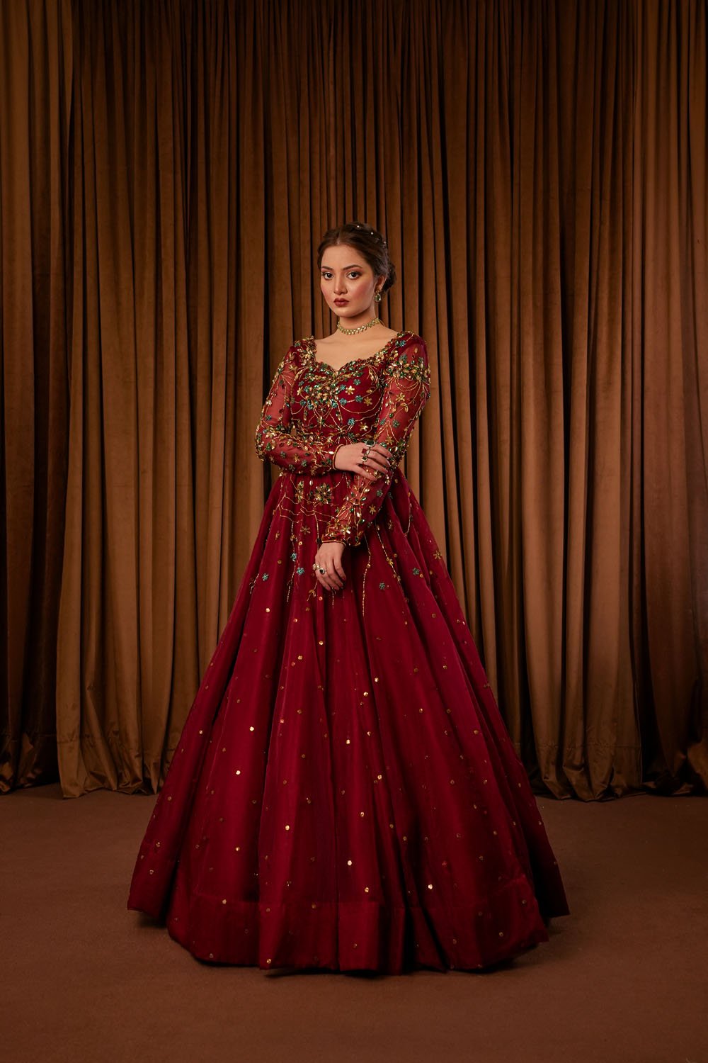 The lehenga carries a majestic nine-yard flare, detailed with matching embellishments and a delicate Mukesh spray that adds a subtle shimmer to the deep maroon fabric. Completing the ensemble is a beautifully crafted dupatta, featuring all-over Mukesh work, sequin detailing, and golden stonework borders for a graceful finish.