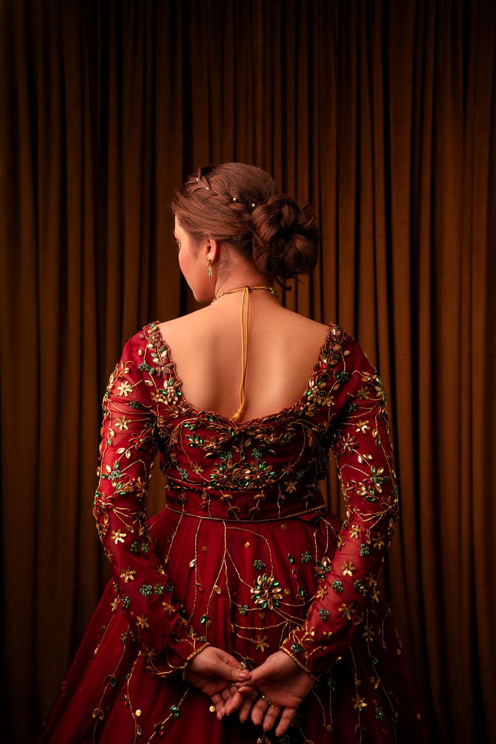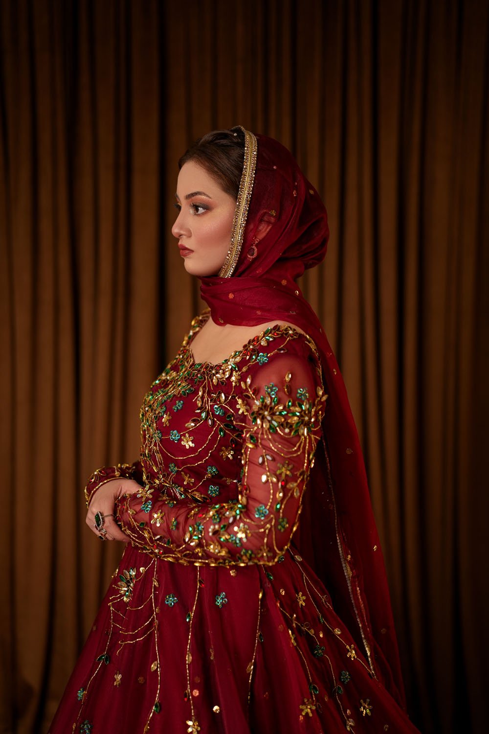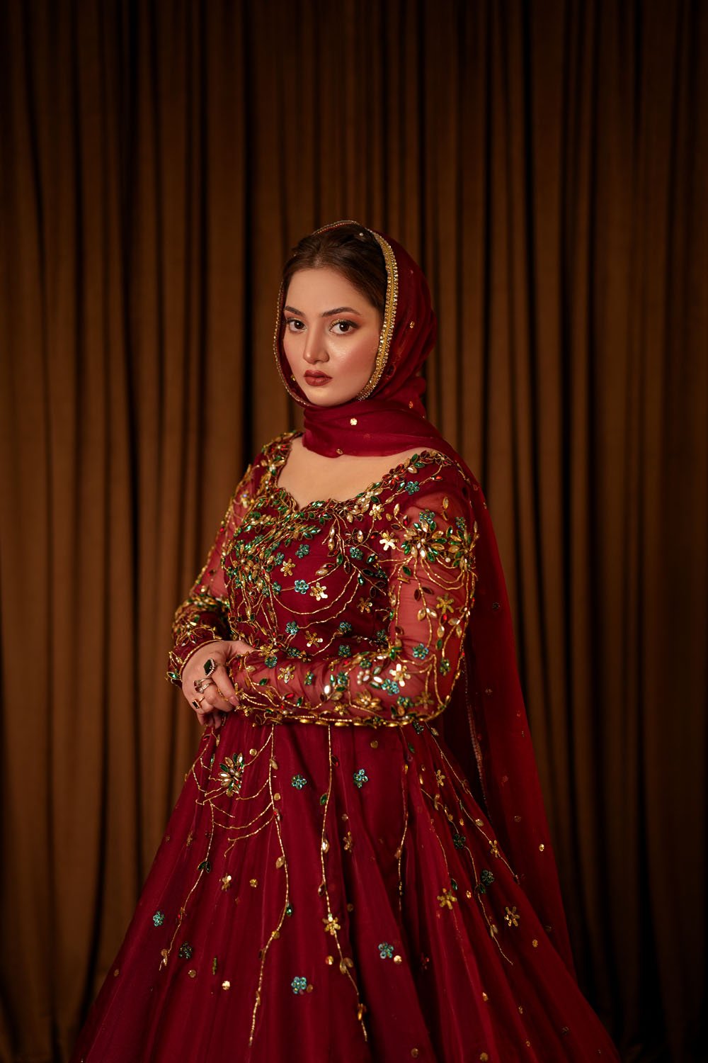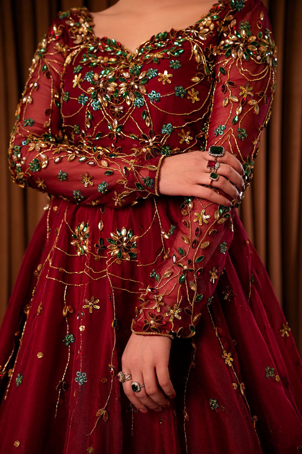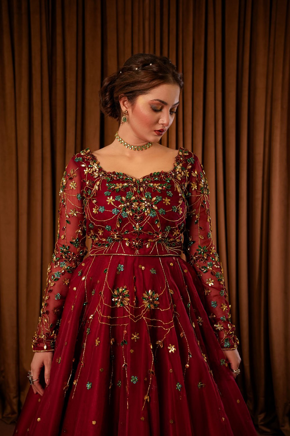 A regal reddish maroon lehenga and blouse set designed for timeless bridal elegance. The blouse is heavily hand-embellished front and back with emerald green, red, and champagne-golden stones, enhanced with golden sequins and intricate dabka work—creating a masterpiece of rich color and craftsmanship.