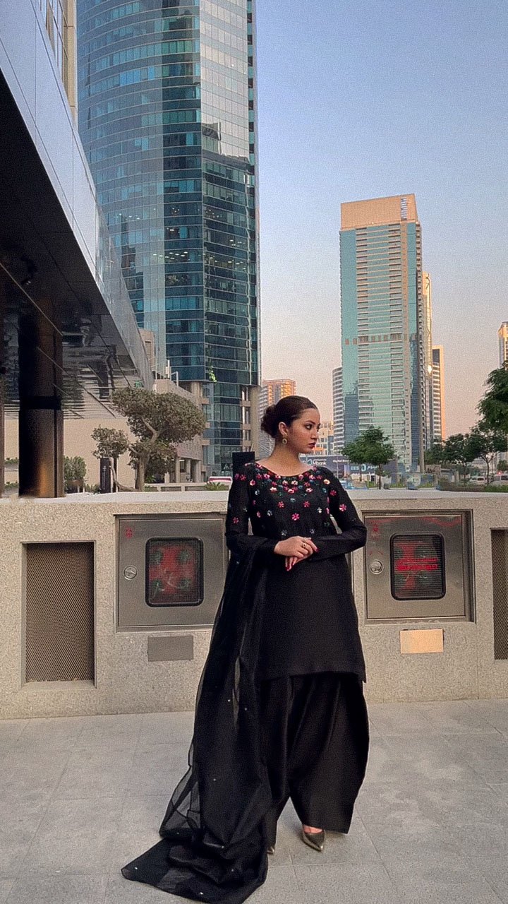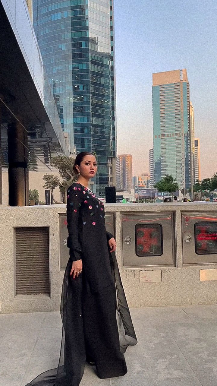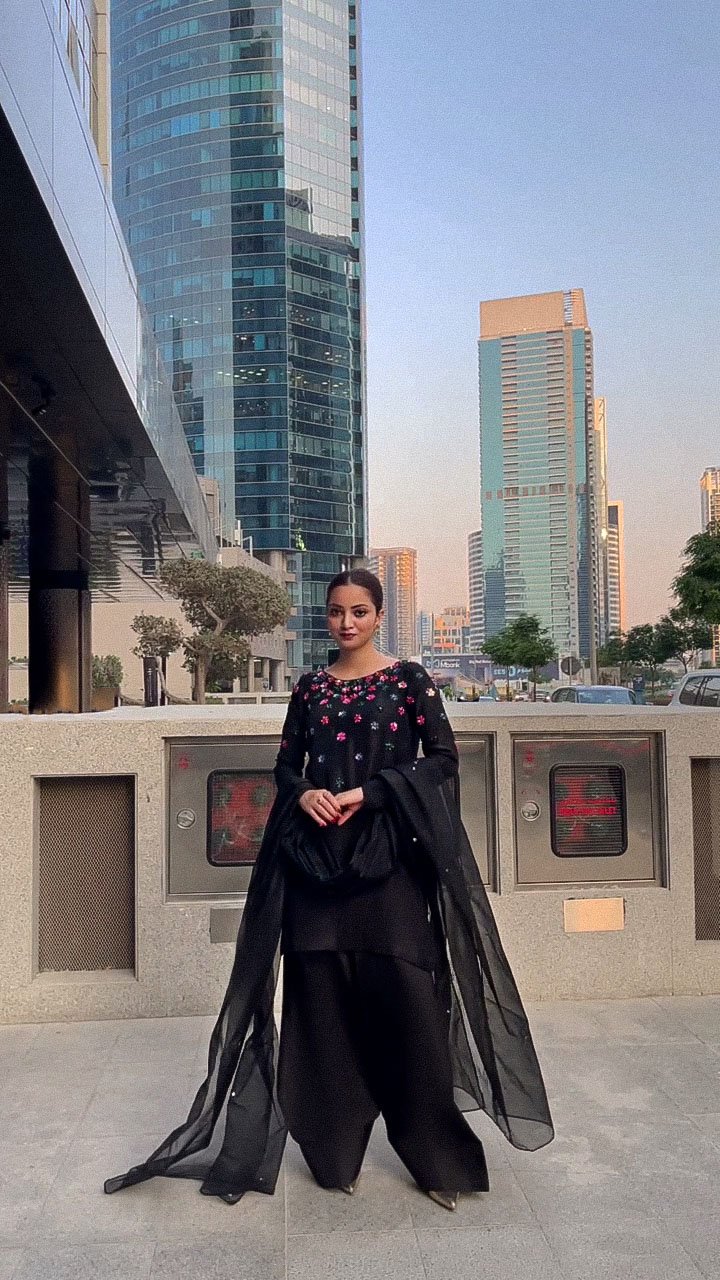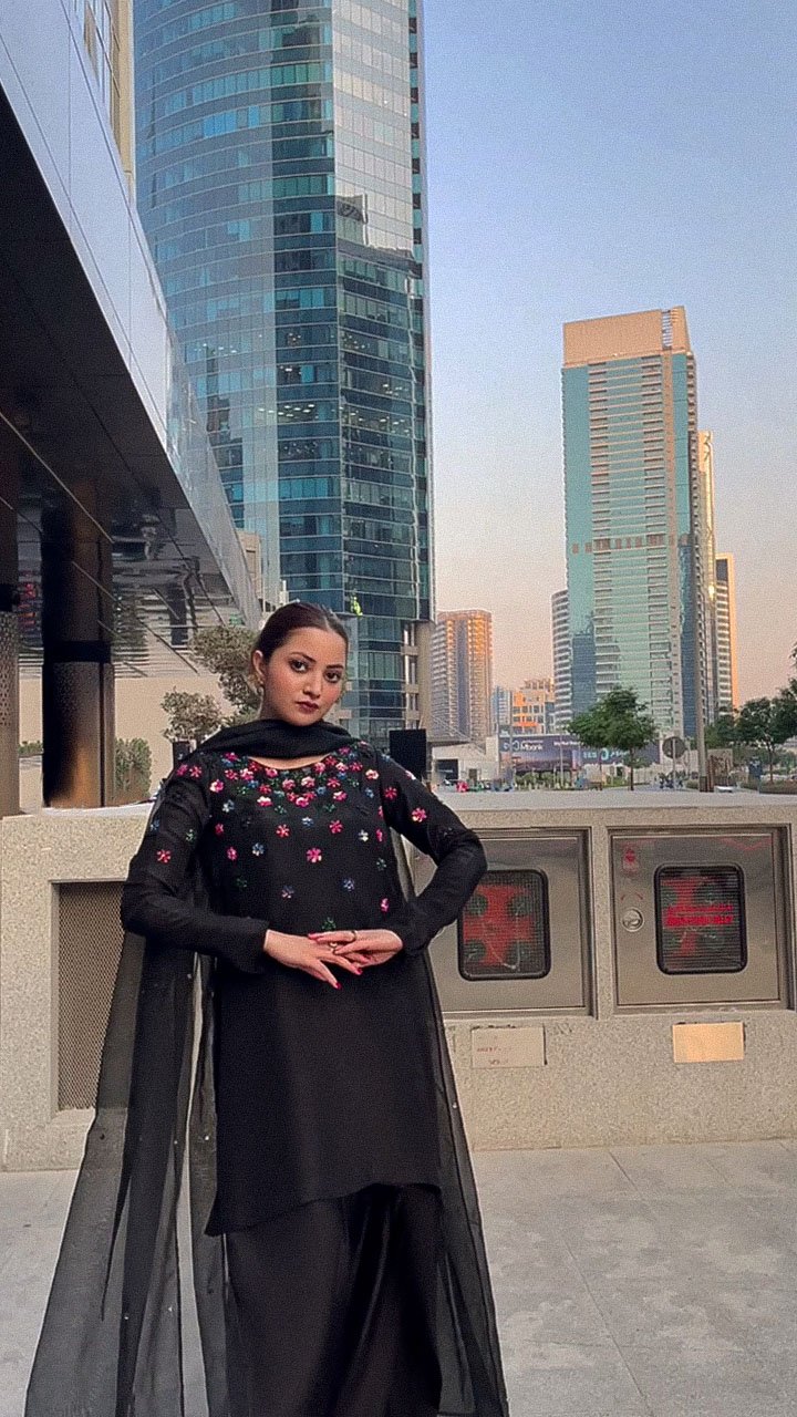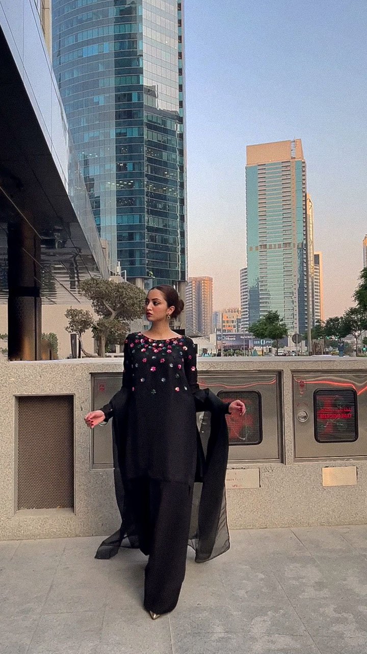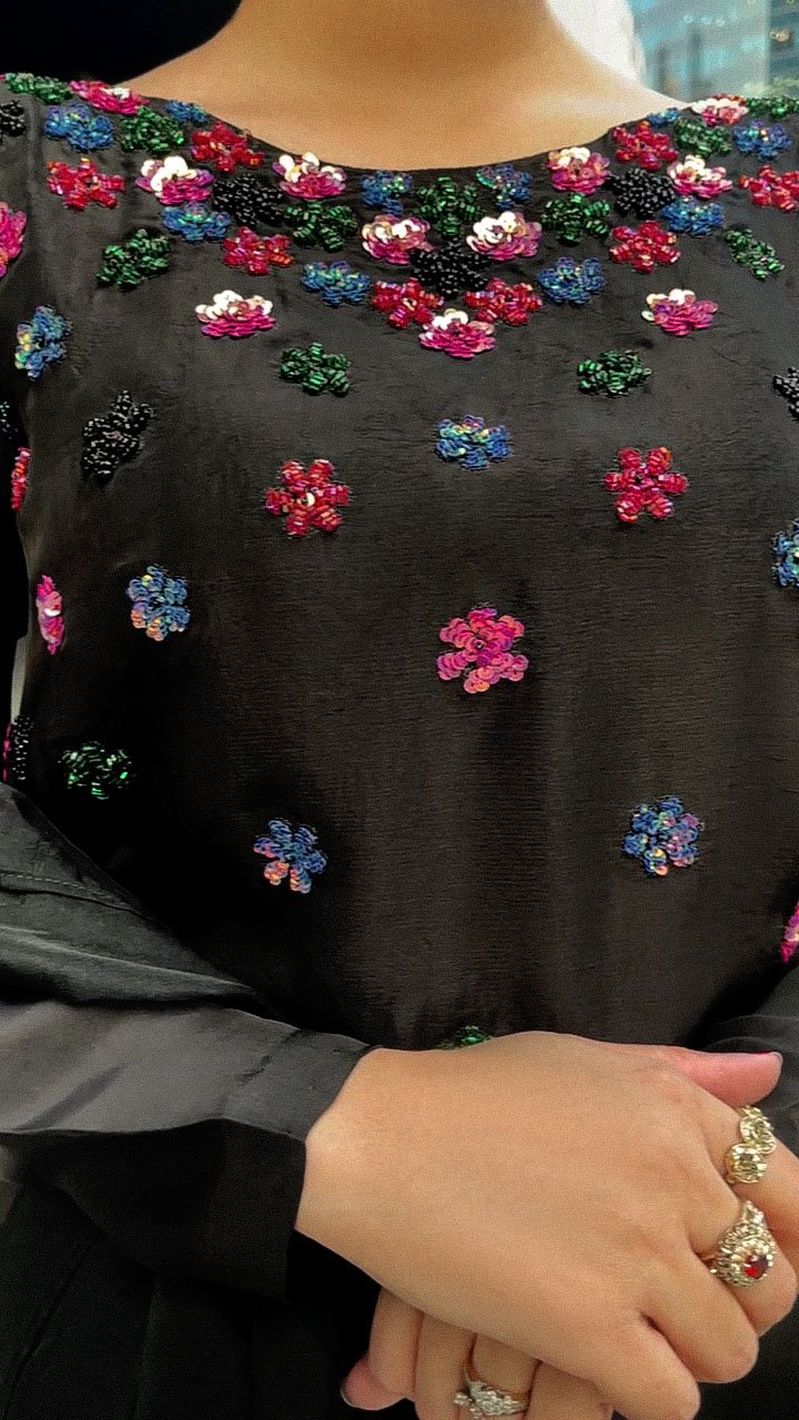 A chic jet-black ensemble crafted in tussel silk, paired with a trendy Farshi shalwar. The shirt features stunning multicolor sequin hand embellishment on the neckline and shoulder area, with floral motifs in vibrant shades of pink, green, and blue. The shirt comes fully lined for a flawless finish. Completing the look is a three-yard organza dupatta adorned with an elegant all-over sequin spray. A bold, modern, and beautifully vibrant outfit.